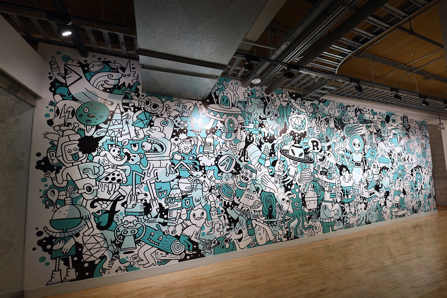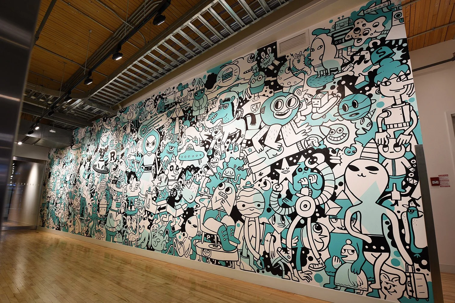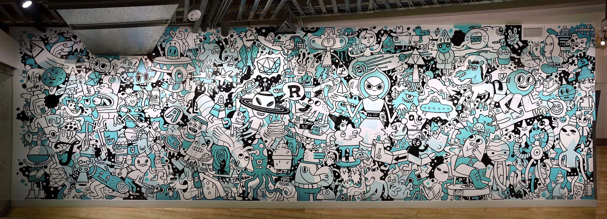 We got to change up our normal colour palette and switch over to a lovely, cool blue-green for this mural at StackAdapt in Toronto. These guys are as cool as their company's colours and, lucky for us, they're art lovers that had a large, blank 28' x 8' (8.5m x 2.5m) wall that needed painting.